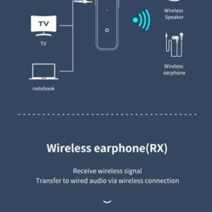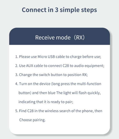 *Bluetooth Receive Mode (RX): Receive Bluetooth signal and transmit it to wired audio through Bluetooth connection