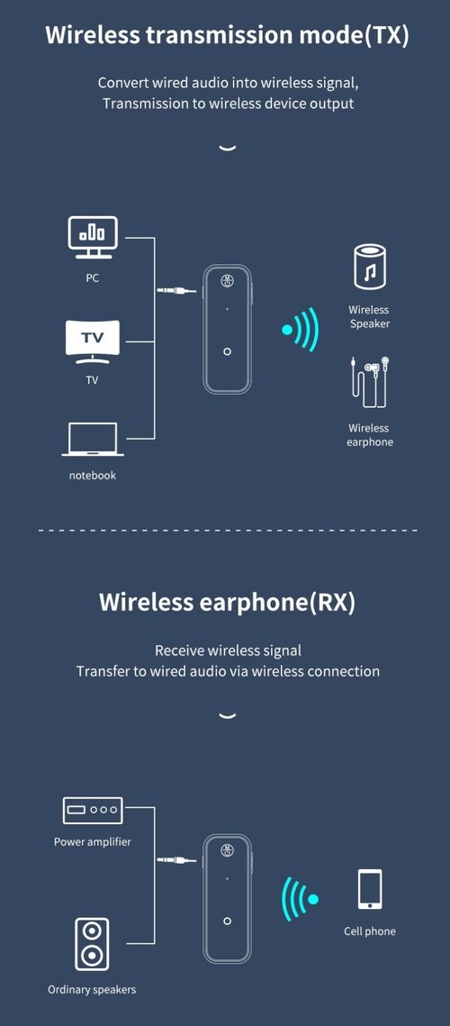 *Bluetooth transmission mode (TX): Convert wired audio into Bluetooth signal, and transmit it to Bluetooth device for output