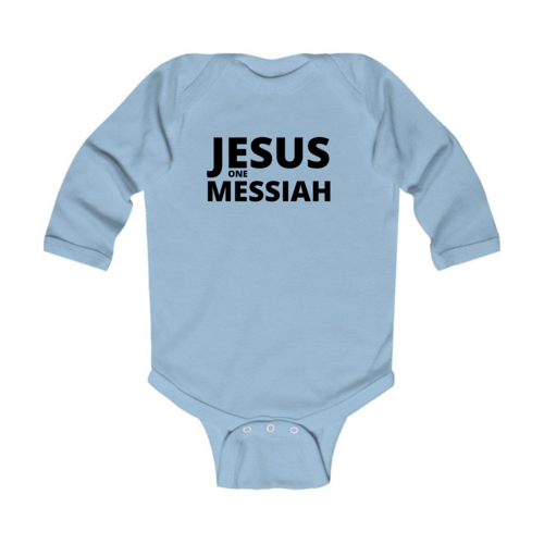 Infant Long Sleeve Graphic T-Shirt Jesus One Messiah Black Illustration. Classic comfort meets color with these soft lap shoulder bodysuits for babies. Whether layered or alone, this bodysuit is soft yet durable enough to stand up to your infant’s playtime demands. This one-piece bodysuit features lap shoulders to make it easier for the many times a day that parents have to change baby’s outfit.