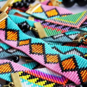 The necklace is woven by Sadie using traditional bead loom techniques, high quality glass beads and a Shh by Sadie pattern. Finished with 24 carat gold plated clamps and complemented with black obsidian and agate beads.