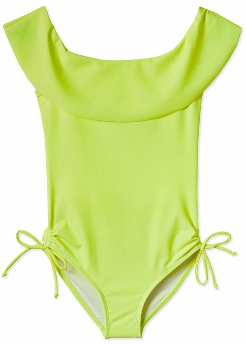 Elegant Jackie O neckline on this modern stand out Neon Yellow bathing suit for girls made from high quality fabric.