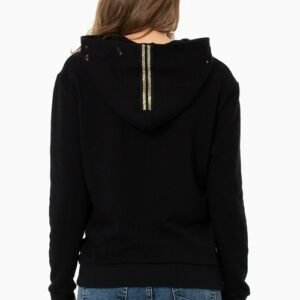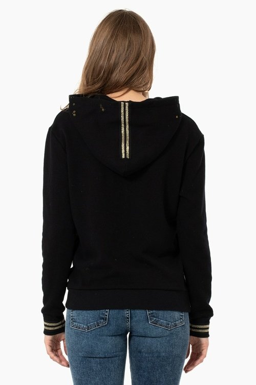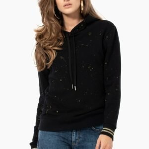 The Raina is a relaxed fit long-sleeved pull-over hoodie. Front length is about 25.5″ from High point of the shoulder at size Small. This style has lurex elastic taped details on the sleeve band and top of the hood, and irregular sparked-splash embellishments on the body.