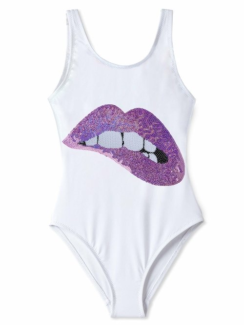 Kiss kiss sequin bathing suit for girls with matching beach cover-up ponchos.